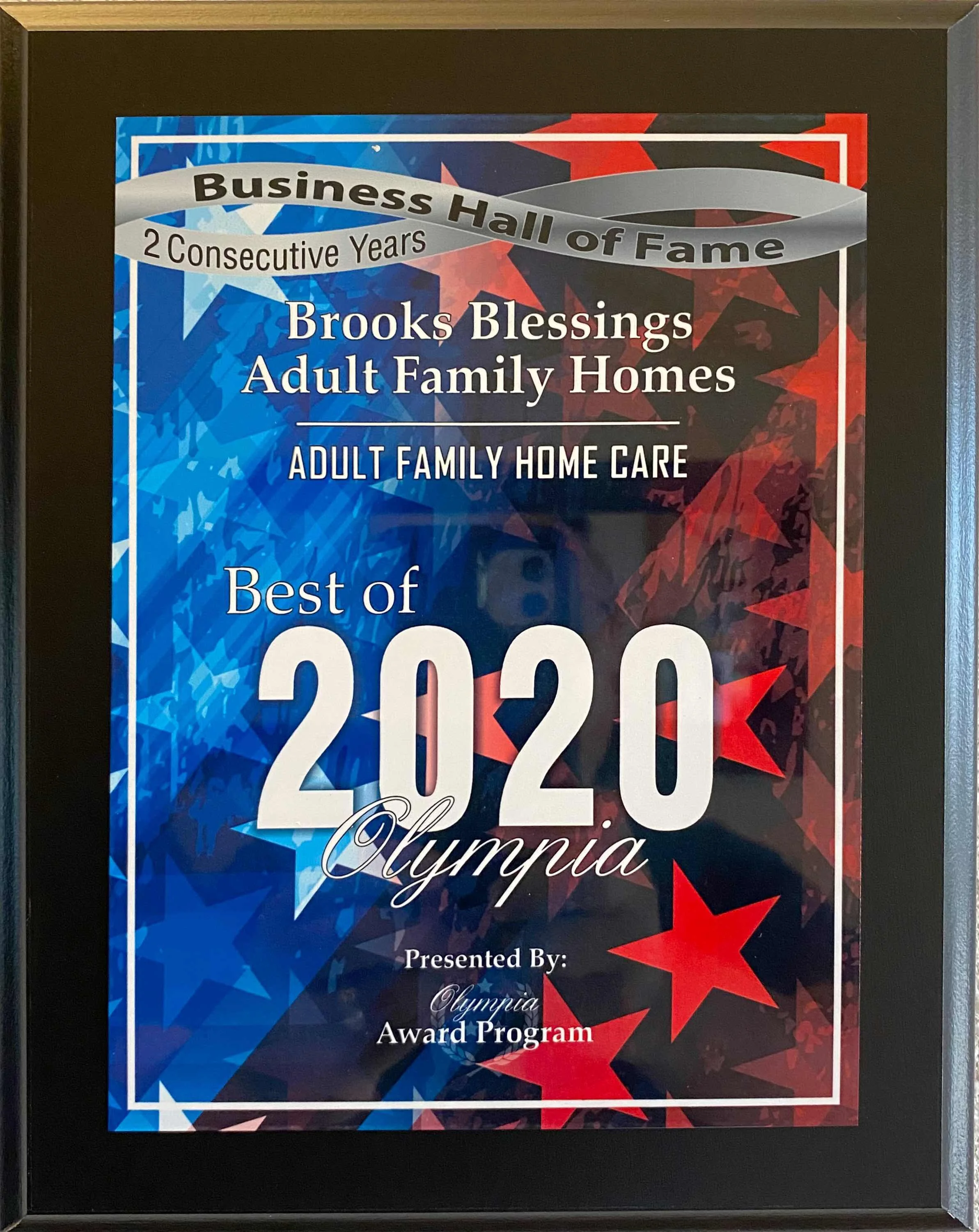 Brooks Blessings Adult Family Homes Is A Proud Member of the Adult Family Home Counsel of Washington State And Has Been Awarded The Business Hall Of Fame For Adult Family Homes In Olympia, WA In 2019 & 2020.