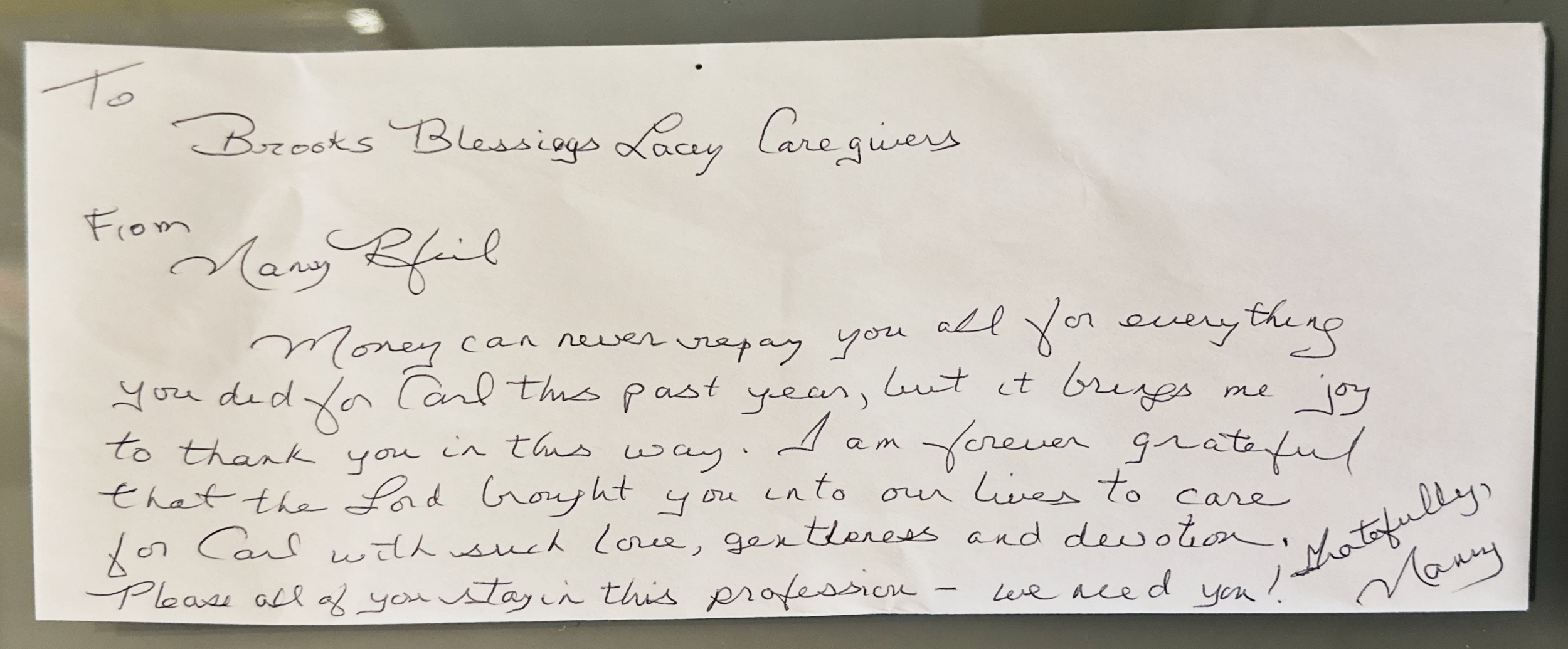 “My mother-n-law who had Alzheimer’s stayed in the Brooks Blessing home, and we loved the care, and the kindness she received from staff, and the Brooks. I cannot say how much it meant to us to have such exceptional care and lovingkindness to our dear mother. I would heartily recommend their facility to anyone looking for long or short term care.”